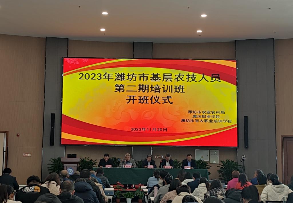 11月20日,2023年度潍坊市基层农技人员培训班在学院滨海校区国际交流中心开班。潍坊市农村农业局三级调研员赵庆胜,潍坊市农村农业局科教生态专班负责人、潍坊市农业技术推广中心副主任王焕之,昌乐、青州、高密、寒亭、坊子、诸城等地的首期150余名基层农技人员,以及潍坊市农业农村局、继续教育学院和合作培训企业相关负责人参加了开班仪式。