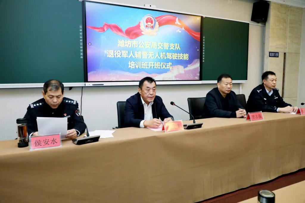 11月22日上午,我院承办的潍坊市公安局交警支队退役军人辅警无人机驾驶技能培训开班仪式在潍坊市警官培训基地举行,潍坊市退役军人事务局党组成员、副局长赵允生;潍坊市交警支队党委委员、副支队长侯安水,潍坊市交警支队政治处主任郑光泉;学院党委委员、副院长贺志强及退役军人辅警40余人参加培训班开班仪式。