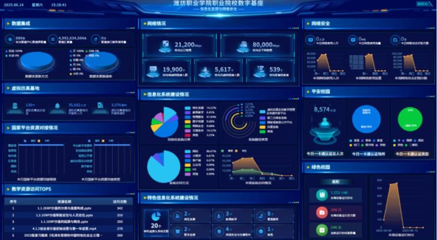 潍坊职业学院聚焦职业教育内部治理中目标标准落实、治理过程动态监测、数据信息集成等难题,构建基于数字技术的“双链驱动、多维融合、数智增效”内部治理体系,打造“一网统管 一网通办 一网共治”的数字化智慧校园。
