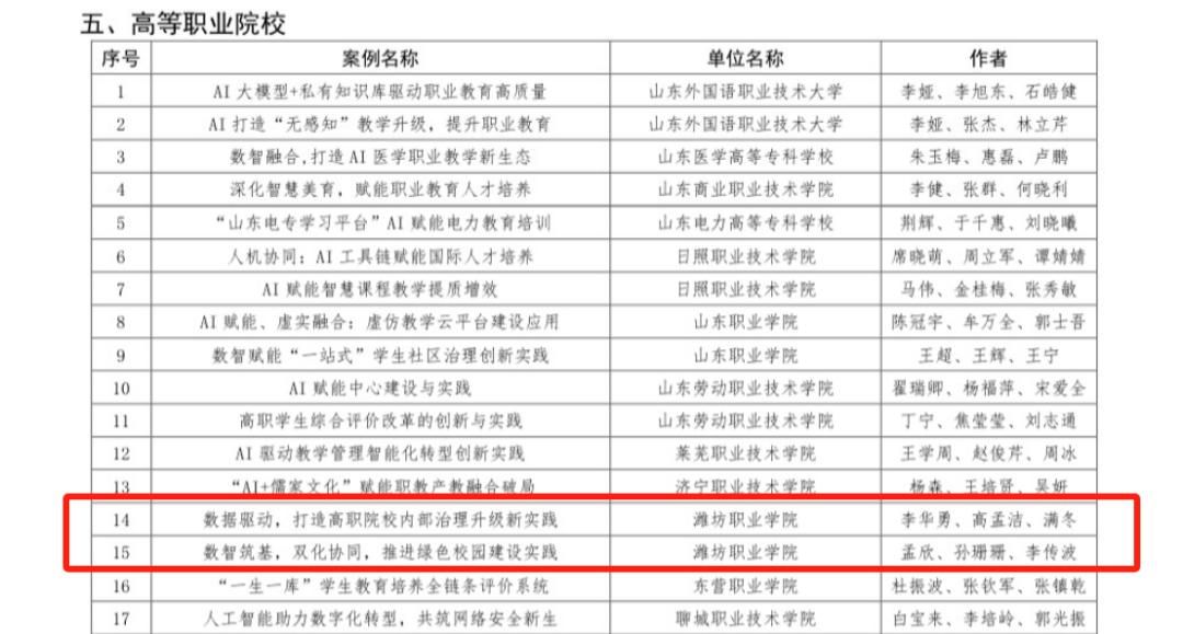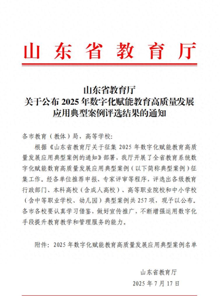 山东省教育厅公布2025年数字化赋能教育高质量发展应用典型案例评选结果发布,潍坊职业学院推荐的《数据驱动,打造高职院校内部治理升级新实践》《数智筑基,双化协同,推进绿色校园建设实践》两项案例成功入选。此次活动旨在落实国家教育数字化战略行动部署,增强运用数字化手段提升教育教学和管理服务能力,全省共评选出257项典型案例,其中高职院校典型案例55项。