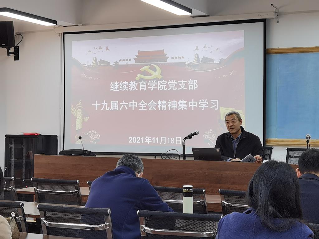 11月18日下午,继续教育学院党支部在奎文校区14号楼405会议室召开了专题会议组织学习贯彻党的十九届六中全会精神,继续教育学院全体人员参加。