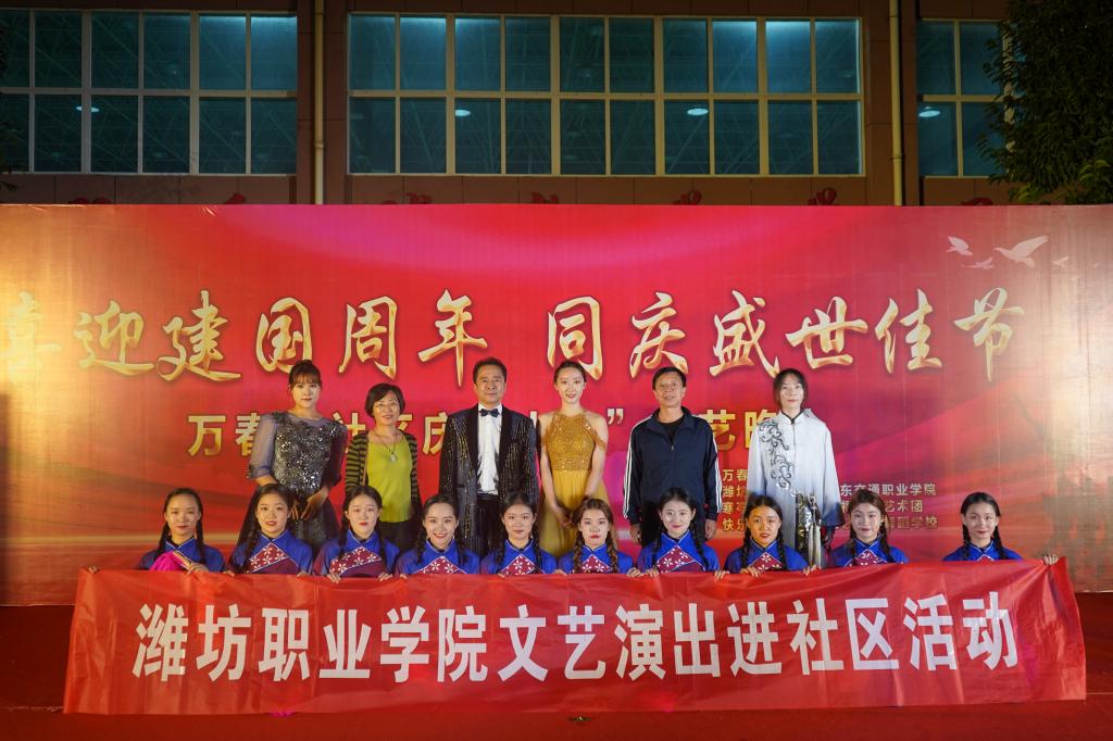 9月29日晚,继续教育学院联合文化创意学院的师生参加了寒亭区万春园社区举办的“喜迎建国周年同庆盛世佳节”国庆文艺晚会。整台晚会高潮迭起环环相扣,参加文艺演出的学生们,用她们嘹亮的歌声、优美的舞姿、朝气蓬勃的精神和扎实稳重的表演,获得了社区群众的一致称赞。王乃田老师和张璐同学担任主持,他们标准的普通话、中气十足的声音、专业儒雅的风格,让在场观众十分佩服。“潍坊职业学院的老师、学生太厉害了,你们表演的节目太震撼了”现场观众发出了由衷的赞叹,还有几个社区领导当场要求联合进行后续汇演。