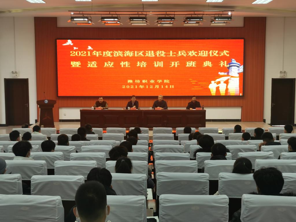 为认真落实中央、省市退役军人工作部署要求,帮助退役军人提升个人知识水平和职业技能,增强竞争能力和创业能力。12月14日上午,2021年滨海区退役士兵欢迎仪式暨适应性培训开班仪式在学院清泽楼报告厅举行。滨海区发展软环境保障局党组书记、局长王建庆及退役军人服务中心、继续教育学院相关负责同志出席了开班仪式。潍坊市各县市区退役士兵代表及志愿入伍学生代表60余人参加本次培训。