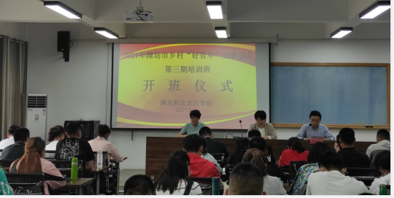 2021年6月1日,由潍坊职业农民学院主办,共青团潍坊市委、潍坊慧三浓职业培训学校协办的潍坊职业农民学院2021年乡村好青年创新创业第三期培训班在潍坊职业农民学院奎文校区举行。共青团潍坊市委副书记刘凡子出席开班仪式,来自寿光市乡村好青年共计87名学员参加培训。