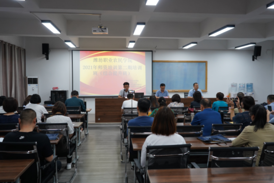 7月17日,2021年师资培训第二期培训班(综合提升班)在潍坊职业学院奎文校区开班。开班仪式由潍坊普创职业技能培训中心董杰主持,潍坊市总工会权益保障部部长周明山、及继续教育学院相关同志出席培训班开班仪式。